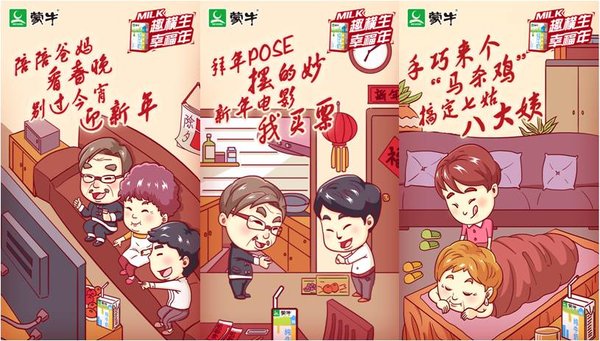 3. 第三阶段-深化巩固:除夕到初六官方每天发布一张年俗海报,紧密结合年俗、传统、年味与牛奶打造七张趣味贺岁系列海报,继续强化蒙牛与幸福味关联和品牌印记,巩固和强化“爱的传承与反哺”的情感认知。