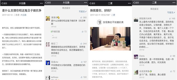 4. 第四阶段-:主题升华:春节过后,直击人们团聚后回归生活工作状态的痛点,联合“大忘路”、“二更” 知名自媒体集中发声,阐述亲情冷暖,描述社会矛盾,折射生活日常,再一次唤醒公众对“爱的传递与反哺”的情感共鸣,引起了网友广泛的自发性传播与积极讨论,将春节营销推向了高潮。