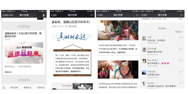互动创意上通过互联网发起征集广大网友的力量,征集拥抱与祝福语,海尔空调为山区儿童带去温暖身体的衣物的同时,也送去温暖心灵的祝福与拥抱。