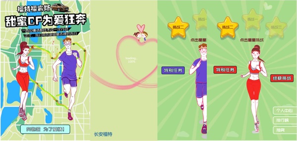 “甜蜜CP · 为爱狂奔”活动:福睿斯与(跑步APP)咕咚平台合作,热恋情侣&无子新婚夫妇参与活动,为家人赢得幸福礼品。1、榜样CP故事预热,激发大家参与热情(H5动画、微博微信热帖、论坛帖) ;2、【甜蜜CP·为爱狂奔】用户参与动机与方式——让网友们跑出自己各式各样的独特表达爱意的图案,然后上传到活动官微和咕咚平台上,票选出的前三名获得奖品;3、车友会活动:通过25个车友接力的方式,每个人跑一段路线,最后把轨迹组合在一起,形成一辆“福睿斯+我和她/他”的全家福的轨迹图案。
