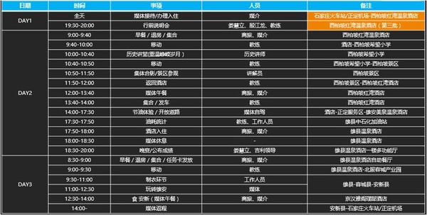活动环节:活动分三批媒体进行,体验西柏坡-雄安的衣食住行各个方面,缅怀历史,展望未来。主要环节有西柏坡景区参观、希望小学历史讲堂和公益捐助、以及西柏坡-雄安的油耗测试比赛。