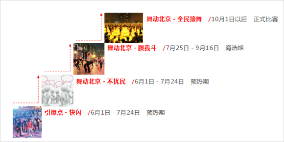 营销策略:海选、初赛、复赛、决赛,1个物定的人物、3个网络平台、N个广场舞热点事件、1部温情的广场舞视频