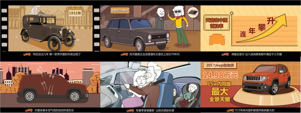 借助移动互联网让更多人了解Jeep自由侠这款车型的优点,着重介绍其全景天窗的功能,并体现其性价比。通过汽车知识说服消费者,提高消费者的购买意愿。