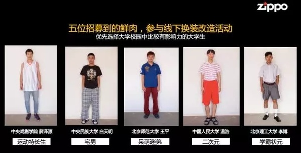 本次Campaign借助招募海报招募五名在校大学生,参与Zippo服饰变装活动,帮助大学生用Zippo服饰打造自己的Style,将Zippo品牌调性宣讲出去,也可以辐射到同年龄年轻人群体中,同时也改变其固有的“Zippo=打火机”概念。