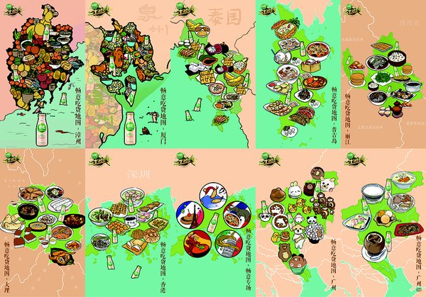 畅意吃货地图:围绕地域“美食”与节目录制城市,创作的原创手绘美食攻略,植入畅意100%“好喝助消化”的核心信息,通过内容与互动活动与“吃货”进行沟通。